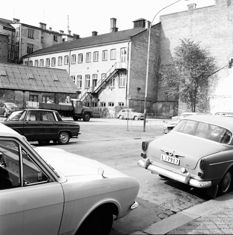 Bilden föreställer en stadsmiljö. I bakrunden flervåningshus. I förgrunden en gata med parkerade bilar och emellan en parkering. En trappa på utsidan av ett hus.