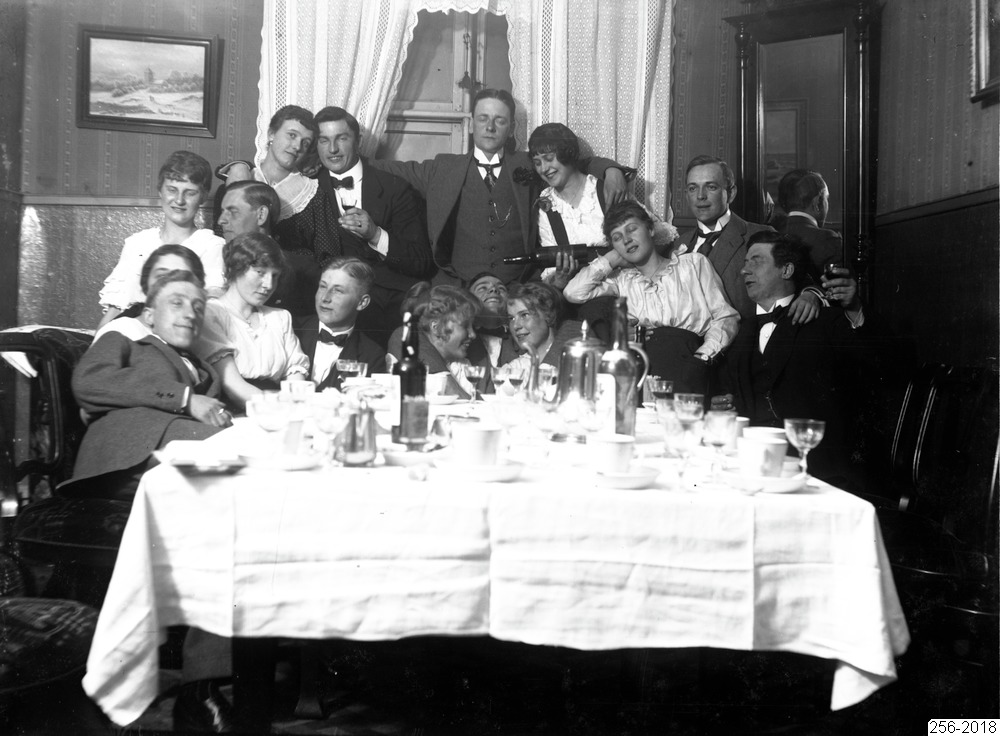 Bilden föreställer 16 personer, kvinnor och män som står och sitter bakom ett matbord. I bakgrunden en spegel, ett fönster med gardiner samt en vägg med en tavla. På bordet ligger en duk. På bordet står vinglas och koppar med fat samt någon kanna.