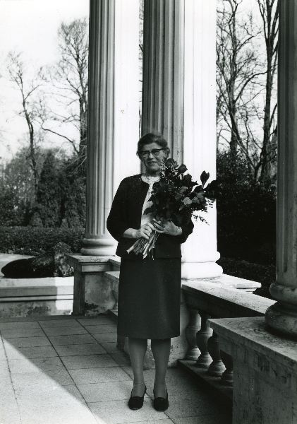 Anna Andersson står med en blombukett vid Vikingsbergs konstmuseum.
