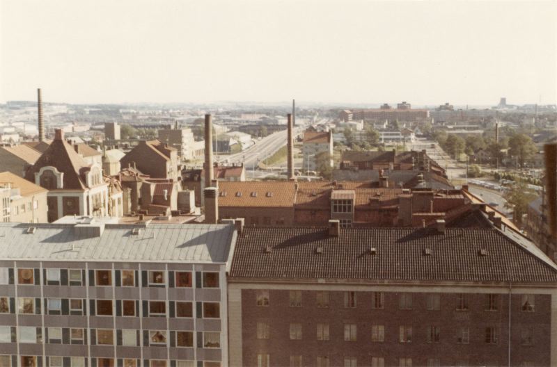 Utsikt från Gustav Adolfs kyrkan mot söder med stora skorstenar i bakgrunden.