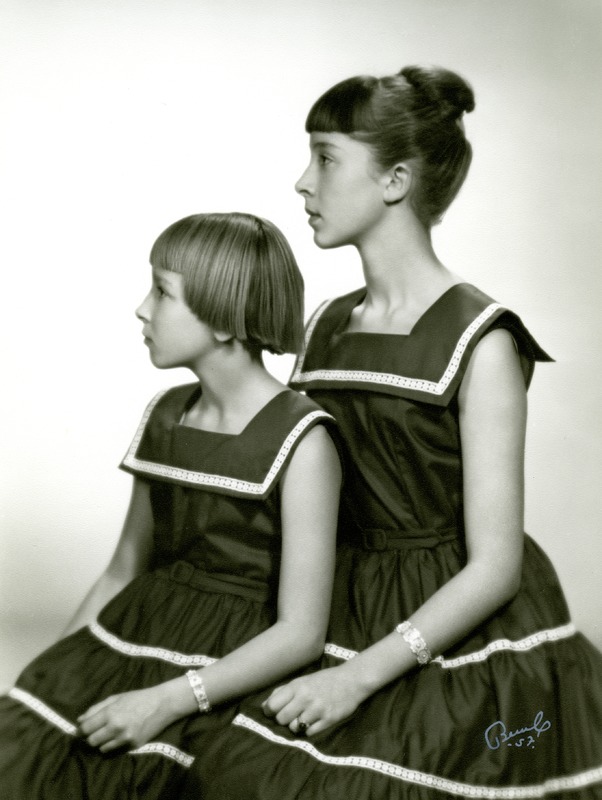 Porträtt på systrarna Birgitta och Kristina Palm. Flickorna har likadana klänningar och sitter i profil.