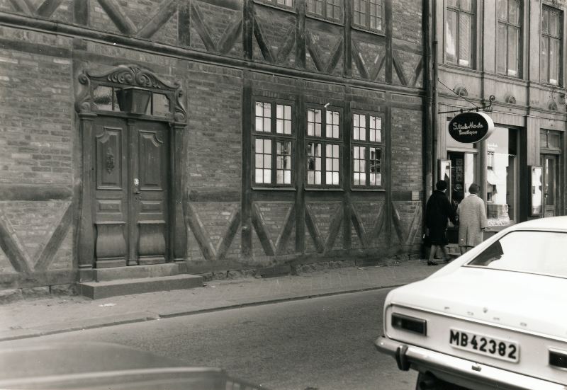 Bilden visar en del av Gamlegårdens gatufasad uppförd i korsvirke med tegel i facken och en lykta monterat i mitten på översta delen av trädörren. Till höger syns ett flervåningshus med butiken Stick Mode Boutiques på bottenvåningen. På trottoaren står två damer.