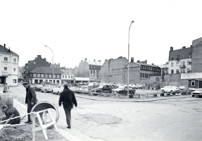 En rivningstomt som tillfälligt har blivit parkeringsplats, i bakgrunden biografen Odéon.