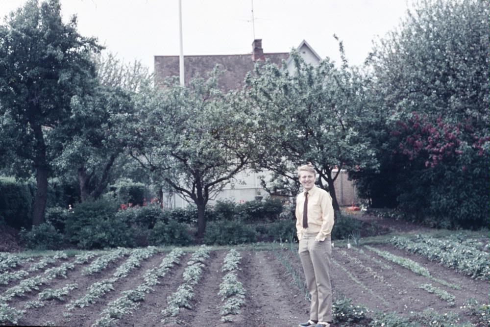 Trädgården till adress Arbogagatan 15. I köksträdgårdsodlingen står husets son, Arne Svensson.
