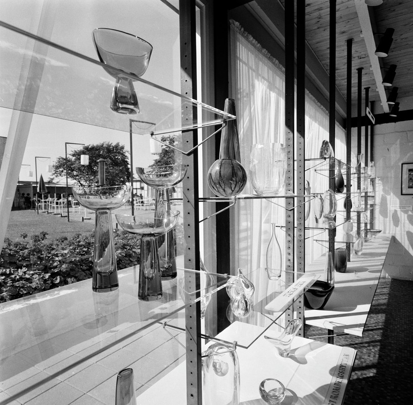 Bilden föreställer en sektion med hyllor framför en vägg med drapperi och framför ett fönster. På hyllorna står olika vaser i glas.