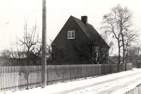 svartvitt fotografi förestälande bostadshus och staket på Arbogagatan 5, kvarter Helena år 1970.