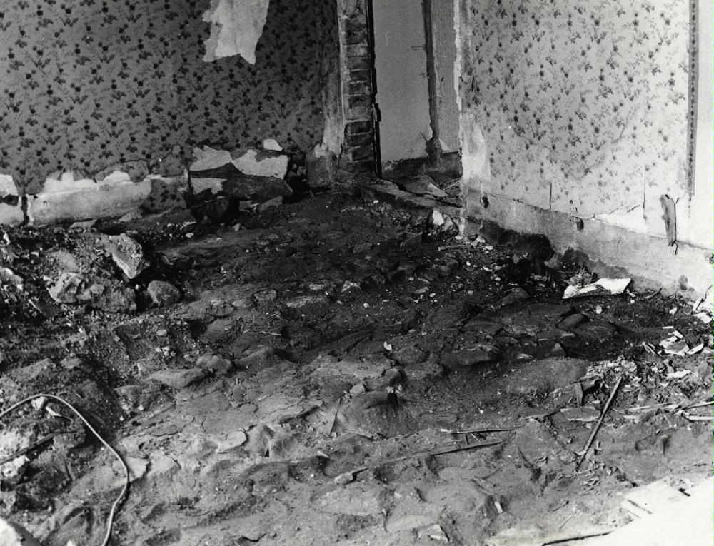 Interiör bild från ett rum. I centrum av bilden nedre delen av en dörr öppning, omgiven av väggar med tapeter på (blommor och bladrankor). Golvet är helt uppbrutet och utgörs av jord. Fotografiet satt ursprungligen i en plastficka i en pärm.
