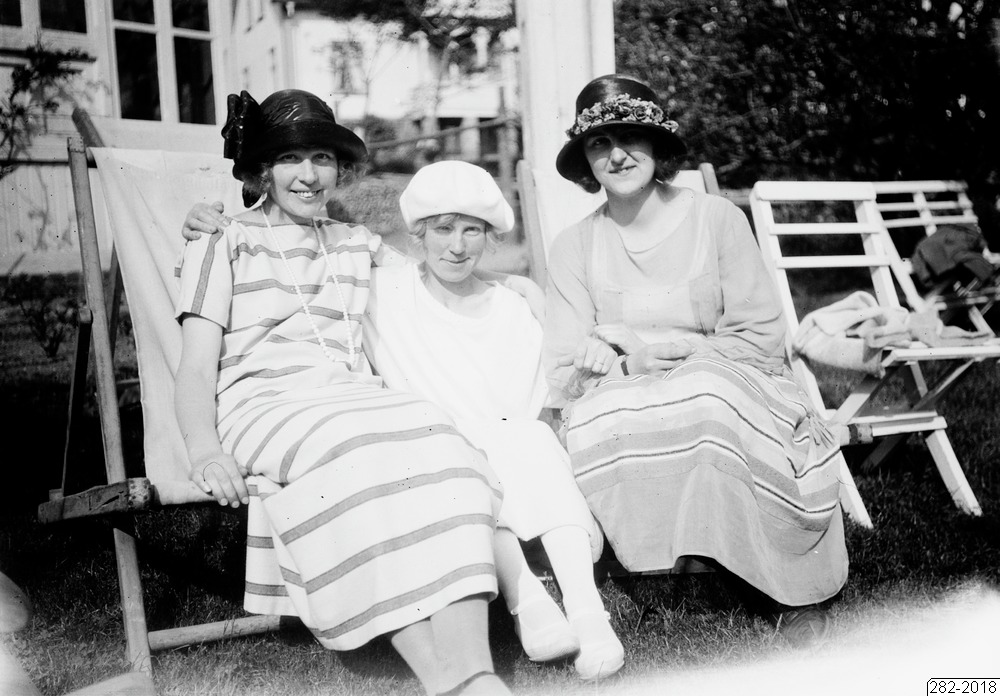 Bilden föreställer tre kvinnor sittande och stående i en trädgård framför en husfasad. Där är två typer av trädgårdsstolar. I bakgrunden till höger växtlighet.