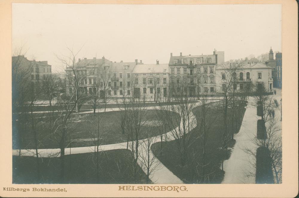 Fotot är taget inifrån Stadsparken mot övre delen av Trädgårdsgatan en lite dimmig vinterdag. Träd och buskar är kala. Gångstigarna har en ljus beläggning och framträder tydligt. Husen längs Trädgårdsgatan syns tydligt i bakgrunden.