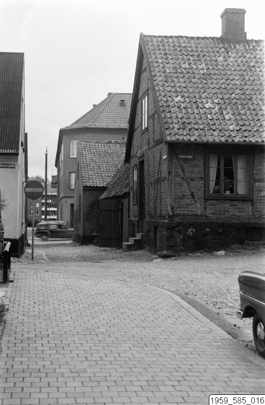 Bilden föreställer en stadsmiljö. I förgrunden en stenlagd trottoar och bakom en grusad gård, eller en grusad gata. I bakgrunden enplanshus och flerplanshus. Det närmaste ett korsvirkeshus med en trappa.