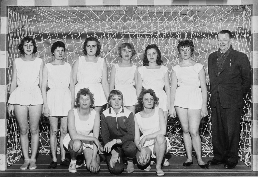 Fotografi som avbildar Påarps damlag i handboll 1957. Avbildade och ståendes i bakersta raden, från vänster till höger har vi: Svensson, Inga-Lill Svensson, Kerstin Karlsson, Siv Björklund Möller, Elsa Lundqvist-Gunnarsson, Eva Persson och lagledaren Ove Persson. Sittandes i den främre raden, från vänster till höger har vi: Karla Dahlgren, Eva Svensson och Birgitta Freij.