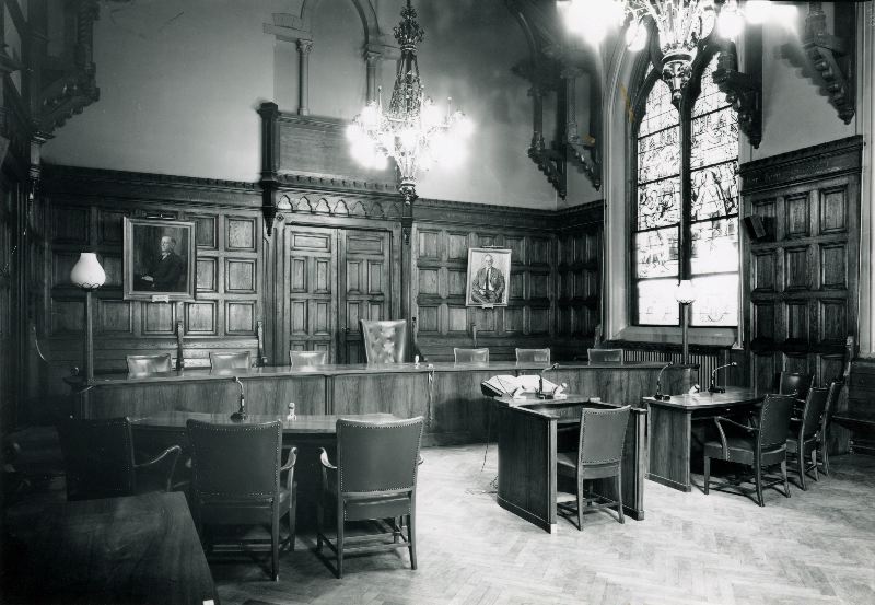 Interiörbild från drätselkammarens sessionssal, väggarna är panelklädda, stora lampor i taket, porträtt av herrar på väggen, ett stort skrivbord i förgrunden och små skrivbord framför.