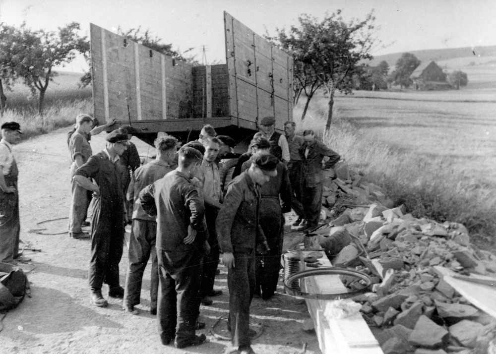 En lastbil har vält. Ett 15-tal män står vid lastbilen, antagligen för att försöka räta upp den.