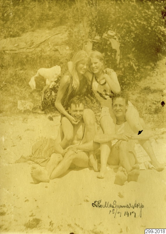 Bilden föreställer fyra ungdomar som sitter på en strand. Dem är klädda i sommarkläder och i buskarna bakom hänger badkläder. (Som 298 men positiv på papper)