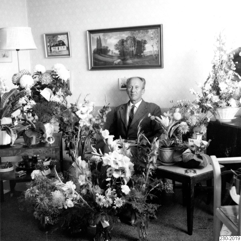 Porträtt av Nils Karlsson på hans 60-årsdag 1960. Nils, iklädd kostym, sitter i soffan i sin bostad omgiven av blommor.