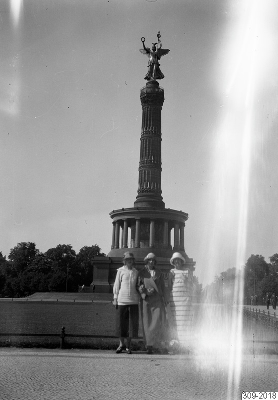 Bilden föreställer minnesmärket Siegessäule i Berlin. Siegessäule (tyska för Segerkolonnen) är ett minnesmärke i Großer Stern i stadsparken Tiergarten i Berlin och en av Berlins främsta turistattraktioner samt sevärdheter. Längst upp finns en utsiktsplattform under Victoriastatyn. I bakgrunden på marken står träd. Framför minnesmärket posserar tre personer.