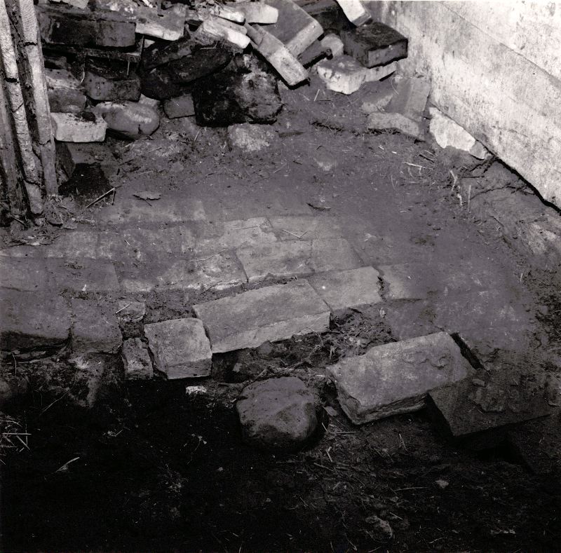 Bunkagården år 1971. Knuttimrat uthus. Köket, tegelgolv, detalj. Foto från sydväst.