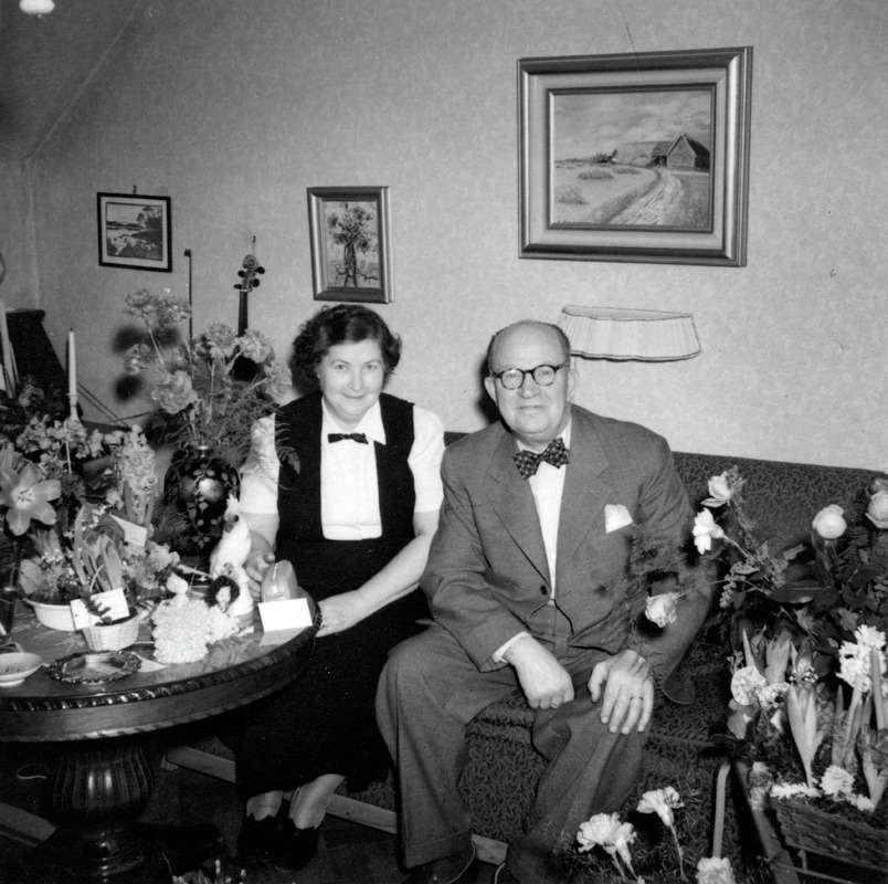Porträtt på Elsa och Axel Lillrud. Elsa fyller 60 år och är omgiven av blommor. Bilden är tagen i parets hem.