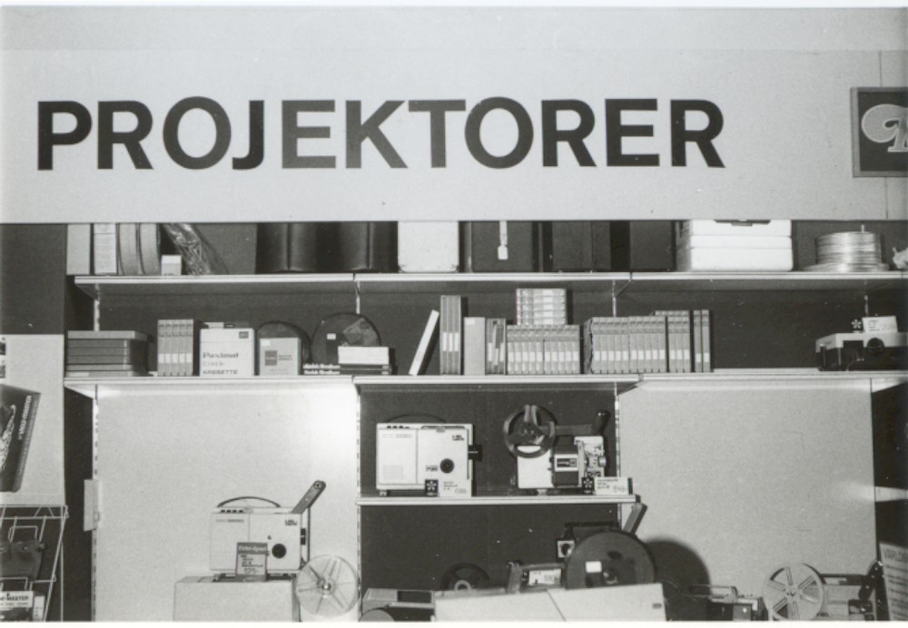 Fotografi som troligen avbildar projektor avdelningen i Hefomas affär på Stortorget 16. Bilden är troligen tagen på 1970-talet.