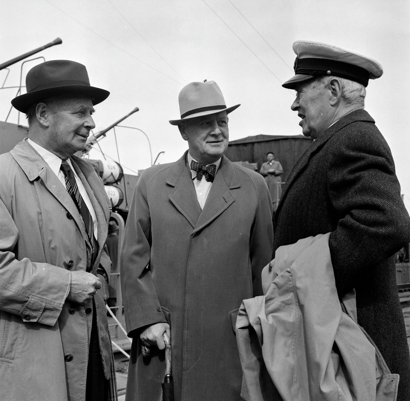 Bilden föreställer tre män fotograferade i trekvartsformat iklädda rock och hatt.