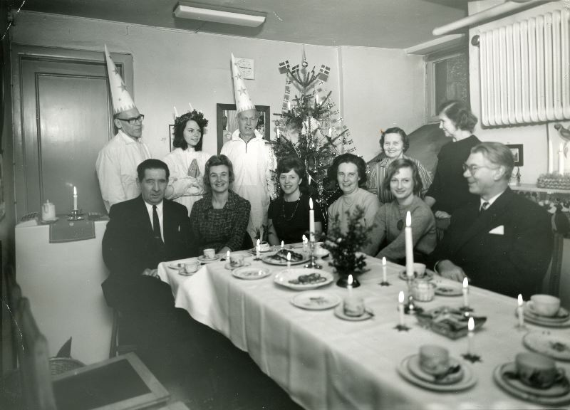 Luciafirande i köket på stadsmuséet. Från vänster sittande: Gustav Salomonsson, Margareta Hansson, Kerstin Eriksson, Elsa Jarlman, Urve Lepason och Lars-Göran Kindström. Stående: Två okända, Knut Svensson, Ingeborg Löfberg och okänd.