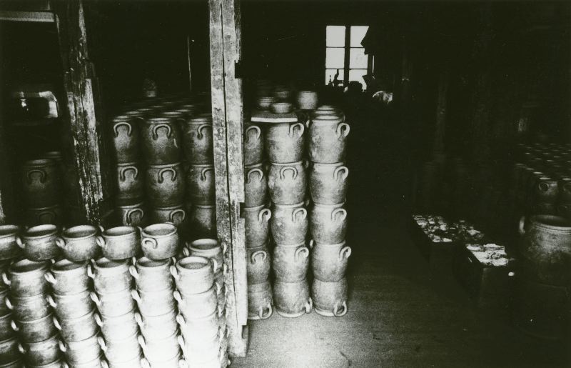 Interiör från Raus stenkärlsfabrik med uppstaplade obrända kärl ca: 1970.