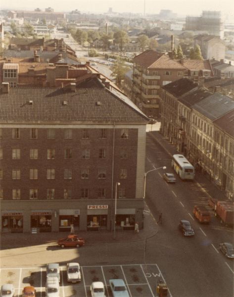 Utsikt från Gustav Adolfs kyrkan mot söder, på denna bild syns lite av Gustav Adolfs torg och några affärer.