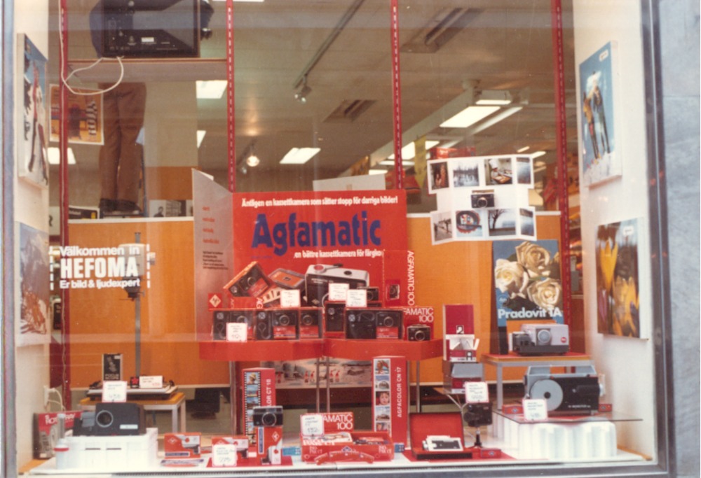 Fotografi som avbildar ett skyltfönster i Hefomas affär på Stortorget 16, i fönstret ser vi reklam för Agfamatic tillsammans med kameror och diabildsprojektorer. Bilden är tagen på 1970-talet.