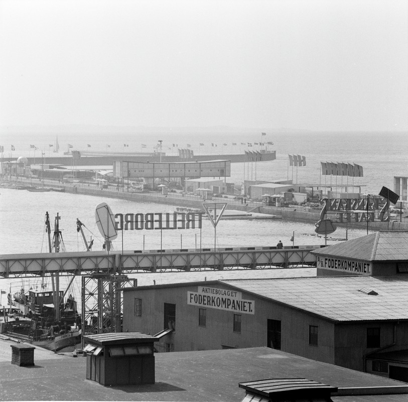 Bilden föreställer i förgrunden ett tak, där bakom en vy över hamn och utställningsområde. Mitt i bild en gångbro. I förgrunden även en byggnad med texten xxxx Foderkompaniet, där ligger också ett fartyg.