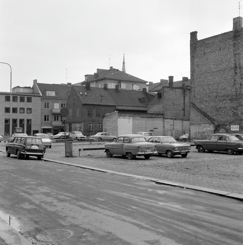 Bilden föreställer en stadsmiljö. I förgrunden en parkering med bilar i bakgrunden hus.
