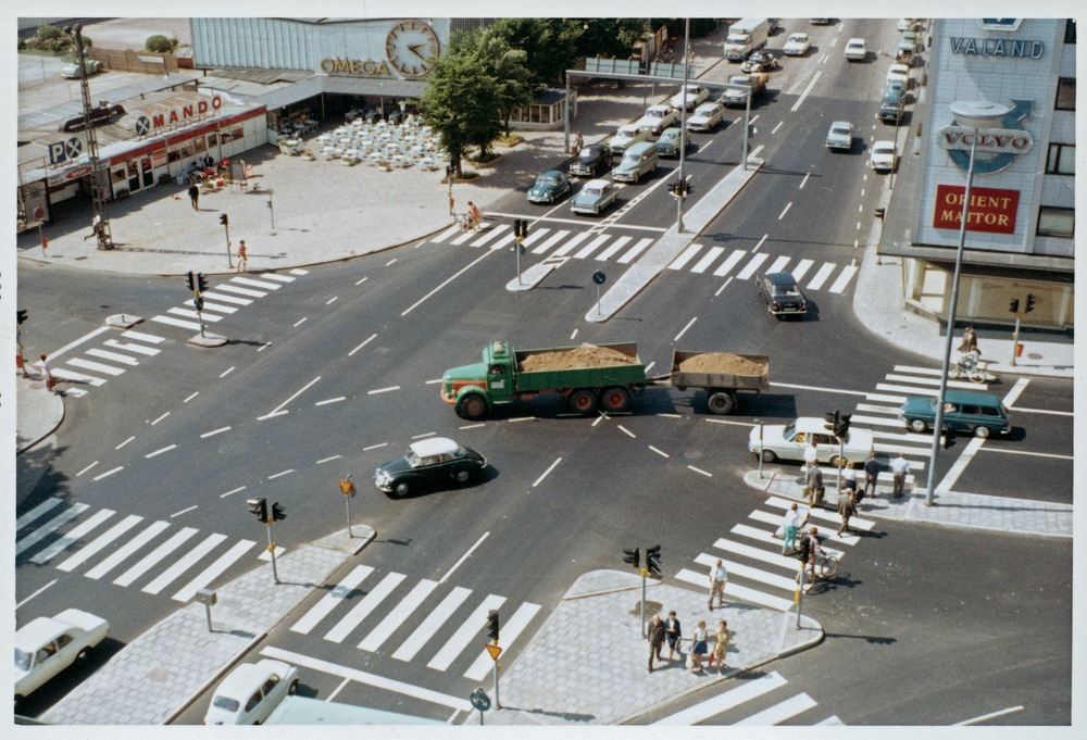 En fyrvägskorsning med trafilkjus och övergångsställe i fågelperspektiv. I korsningen kör bilar samt en lastbil. I kanterna skymtar byggnader. Till vänster en uteservering
