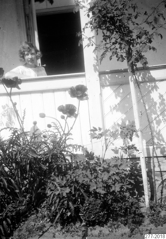 Bilden föreställer ett litet utsnitt av en husfasad med del av balkong. På balkongen står en kvinna. På marken en rabatt och ett litet träd.