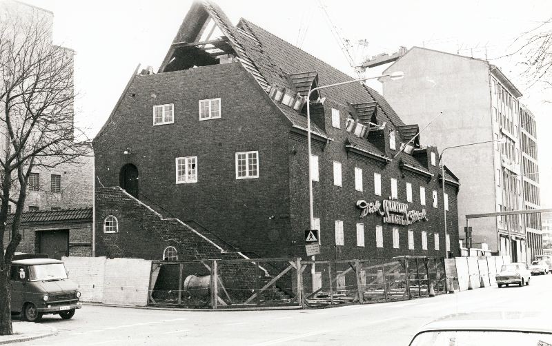 Bilden visar byggnad, så kallade "Hofvendalska huset", i hörnet mellan Bollbrogatan och Järnvägsgatan, år 1971. Mitt på fasaden syns skylten "Drick Skånskt Kaffe, Stark Smak". Sadeltaket är nerrivet på gavelsidan. På trottoar syns byggmaterial samt byggutrustningar. På bilden syns även trafikskyltar och gatubelysning.