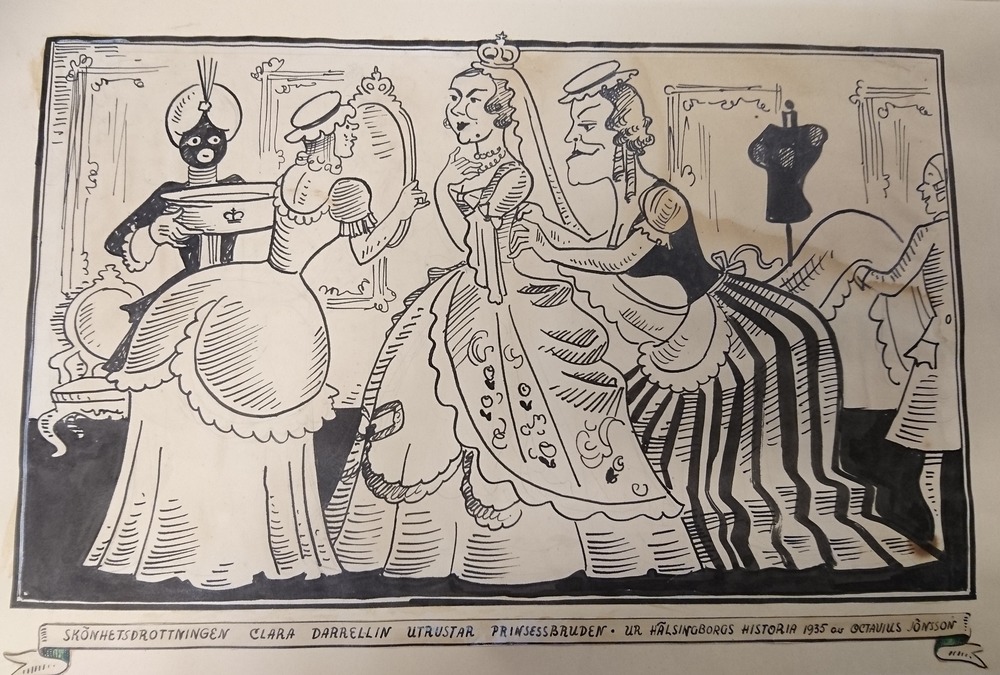 Teckning i tusch föreställande Calra Darell i ateljén.