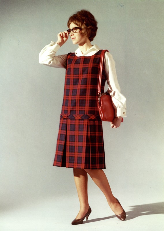 Birgitta Palm poserar i en klänning från Margita konfektion. Över axeln hänger en handväska.