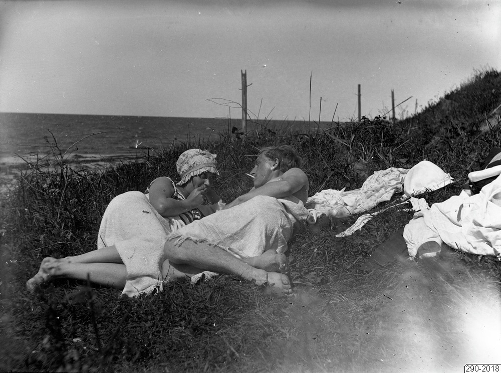 Bilden föreställer en kvinna och en man liggande i gräset på en strand bägge röker. Hav i bakgrunden.
