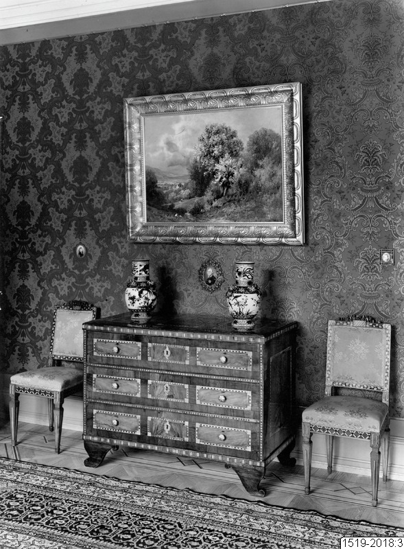 Fotografi som föreställer ett byra och två stolar. Ovanpå byrån står två vaser, på väggen bakom hänger en tavla med landskapsmotiv. Skåpet är fotograferat i hemmiljö i Trapps lägenhet på Södra Storgatan 18.