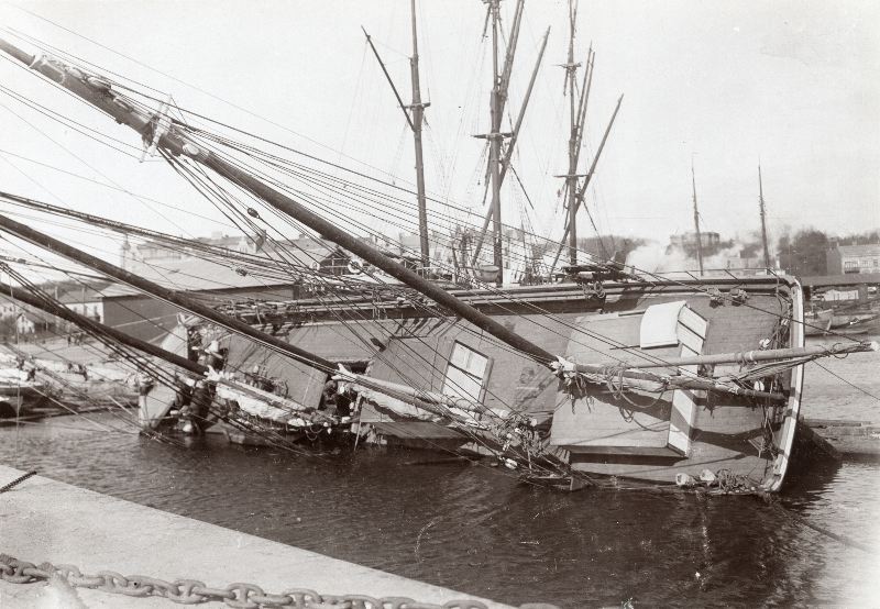 Bild av en stor segelbåt som har kantrat i Helsingborgs hamn.