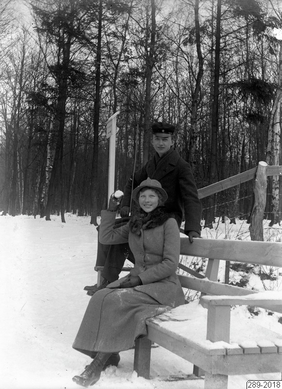 Bilden föreställer en vkinna och en man sittandes på en bänk framför ett staket. Skog i bakgrunden.