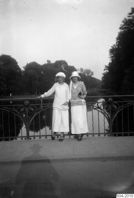 Bilden föreställer två kvinnor som lutar sig mot ett staket på en bro, träd i bakgrunden.
