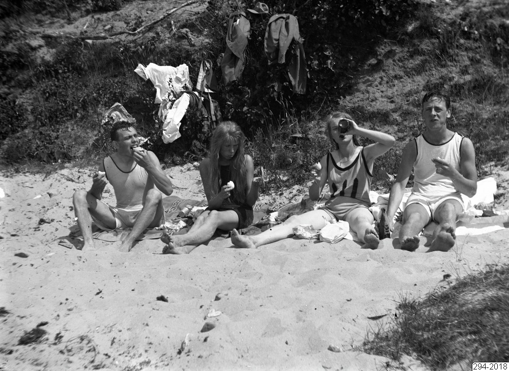 Bilden föreställer fyra ungdomar som sitter på en strand och äter matsäck. Dem är klädda i sommarkläder och i buskarna bakom hänger badkläder. (jämför 297)