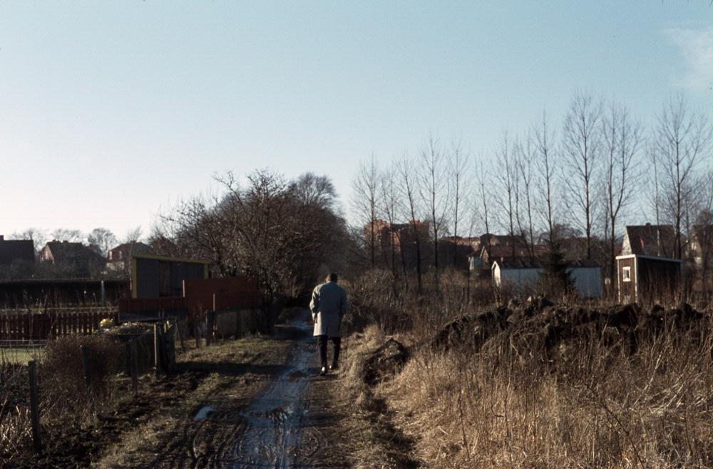 Väg genom Husensjö mosse. Till vänster låg odlingslotter som tillhörde Meiljling. I bakgrunden syns transformatorstationen på Jänlöpingsgatan. Mannen på bilden är fotografens bror, Lars Pettersson.
