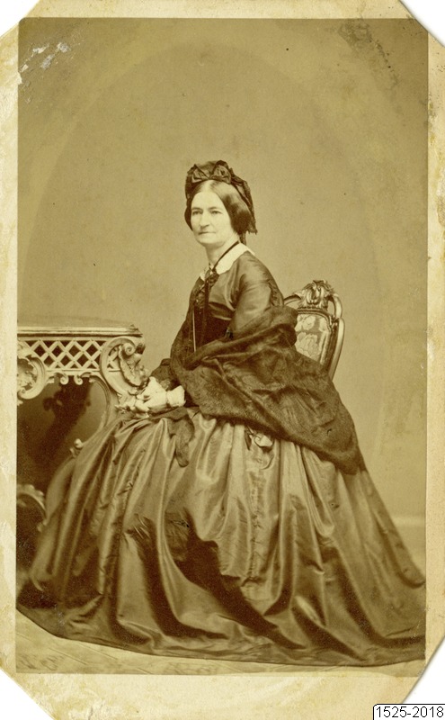 Visitkortsfotografi som föreställer sittande kvinna i en fotoateljé