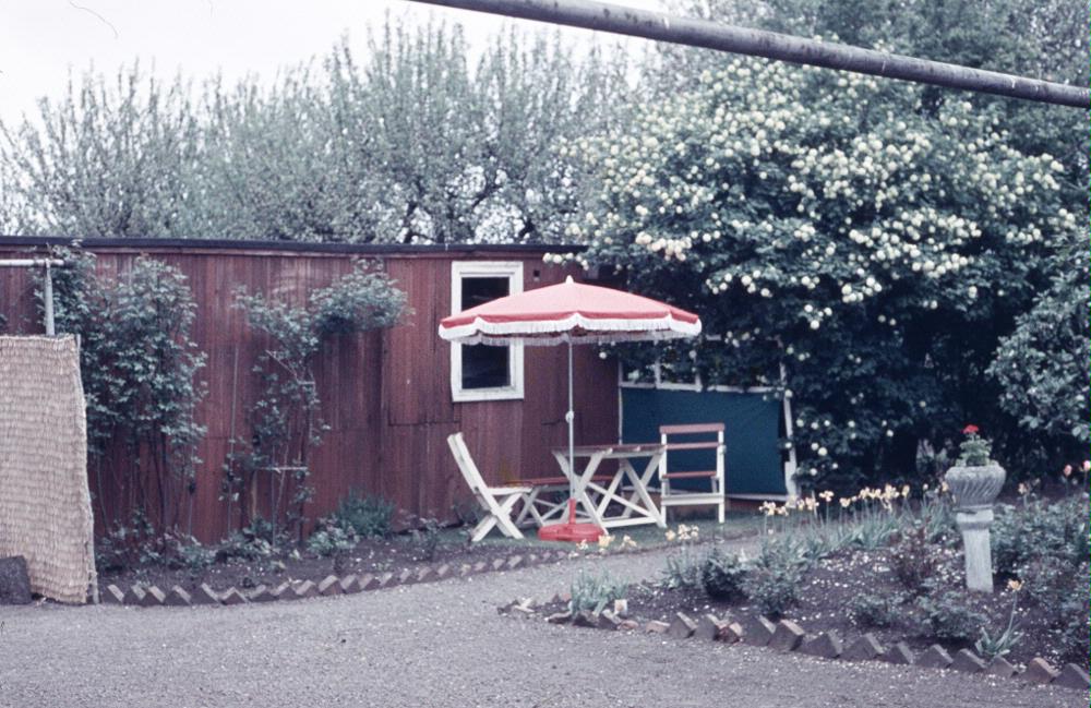 Trädgården till adress Arbogagatan 15.På bilden syns en uteplats med trädgårdsmöbler och parasoll.
