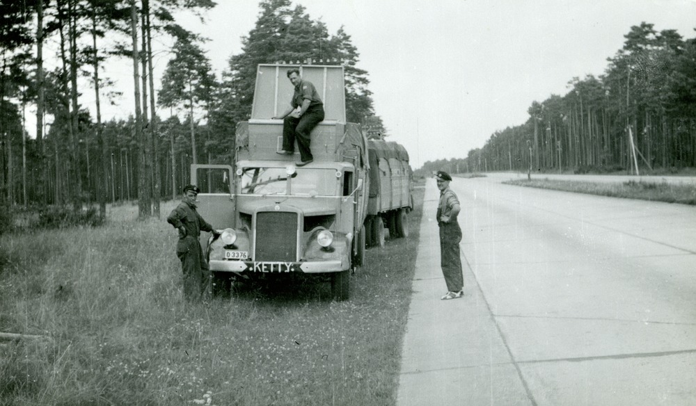 Lastbilen märkt "KETTY" har stannat vid en vägkant. Två män står bredvid och den tredje sitter på bilen.