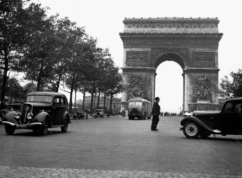 Fotografi av hur en Linjebuss kör i Paris. I bakgrunden syns Triumfbågen.