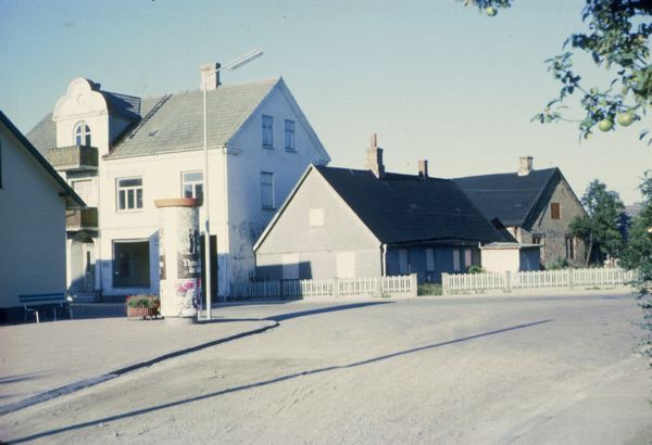 gatumiljö i Höganäs, på gathörnet finns en affischstolpe med b la en affisch som gör reklam för en förestälning med trollkarlen Bob Arlo.