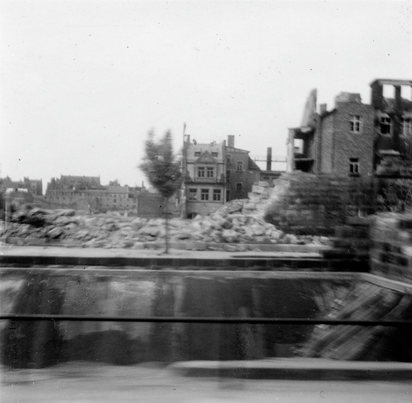 En lastbil från Linjebuss kör igenom en tysk stad i ruiner, ev. Hannover.