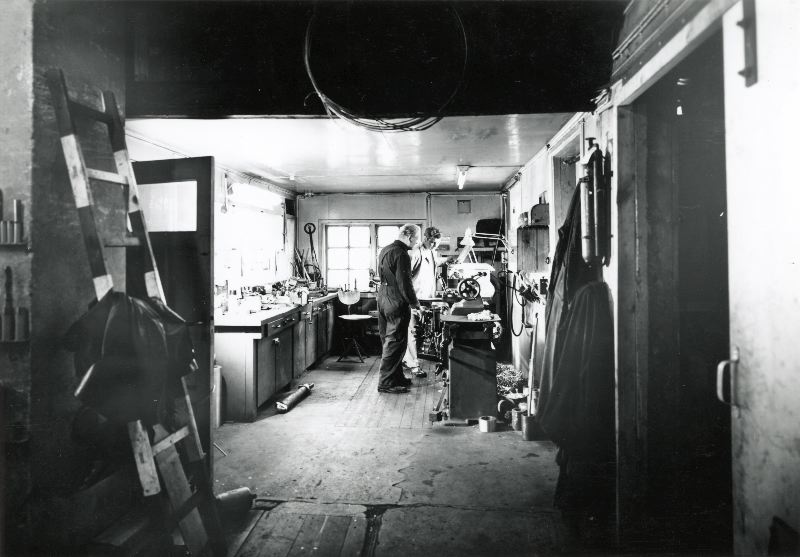 Bild av av två arbetare som står och arbetar i en verkstad, Kranverkstadens södra, västra intill varvet i Helsingborgs hamn.