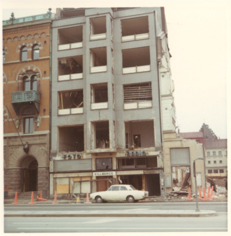 Fotografi som avbildar rivningen av fastigheten på Järnvägsgatan 3 som innan höll Hefomas affär, bilden är tagen februari 1972.